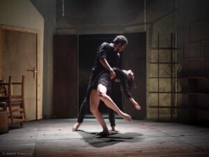 En este dúo de danza y mimo el pasado y el presente se entrecruzan para mostrarnos el día a día de una pareja y como deben afrontar el transito emocional de un luto.
